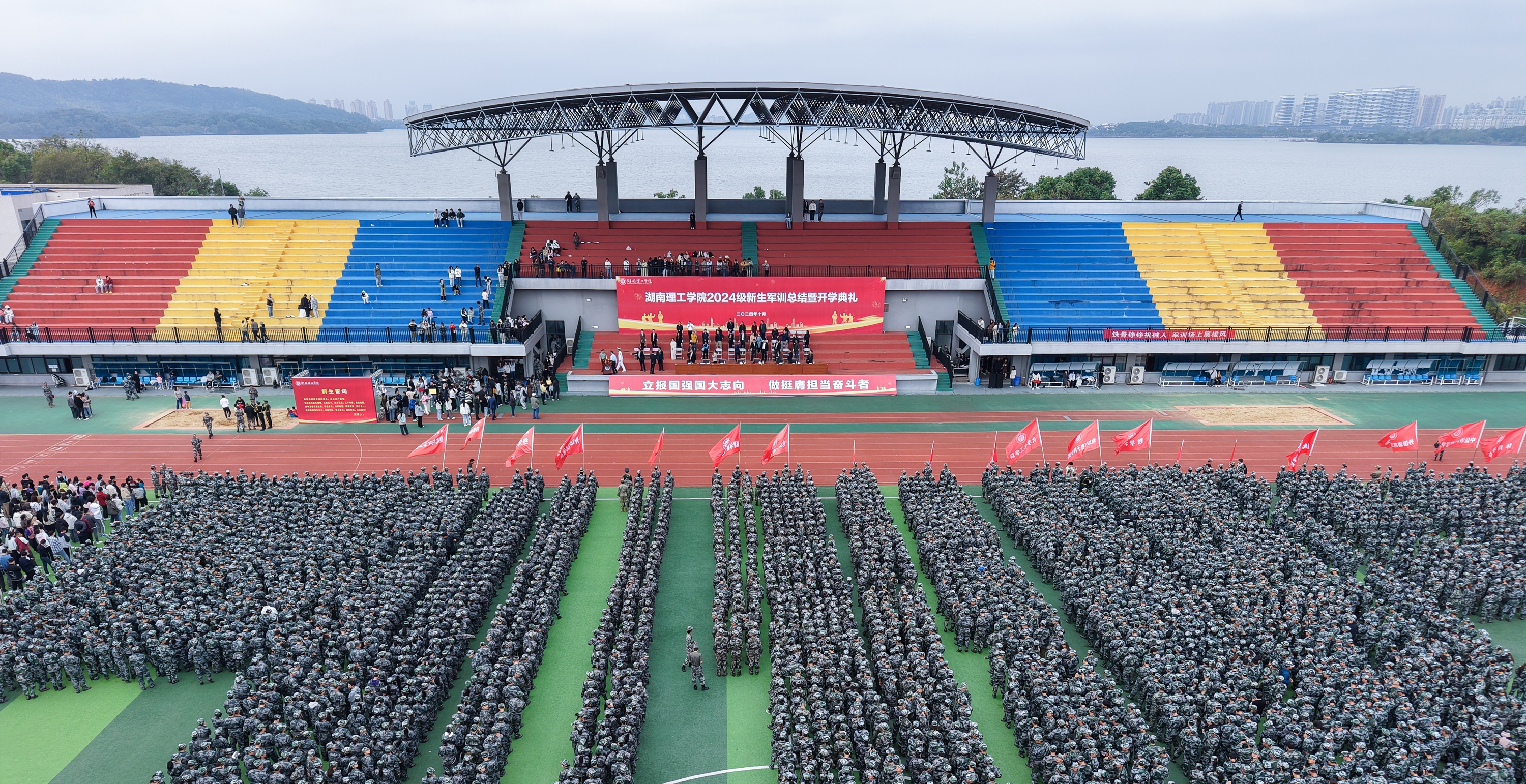校园网讯 10月20日上午,2024级新生军训总结暨开学典礼在南院田径场举行。校领导张国云、曾祥君、谢贵辉、徐小立、徐振祥、丁跃浇、刘长辉、胡文静参加仪式,典礼由党委委员、副校长徐振祥主持。军训总结仪式在《强军战歌》中拉开序幕。气势磅礴的擒敌拳和教官的刺杀操、匕首操表演动人心魄,伴随着分列式进行曲的鼓点节奏,2024级新生们走过主席台,他们注视着前方,脚下坚定而有力,心中怀揣着的对党的忠诚与热情,对未来的憧...