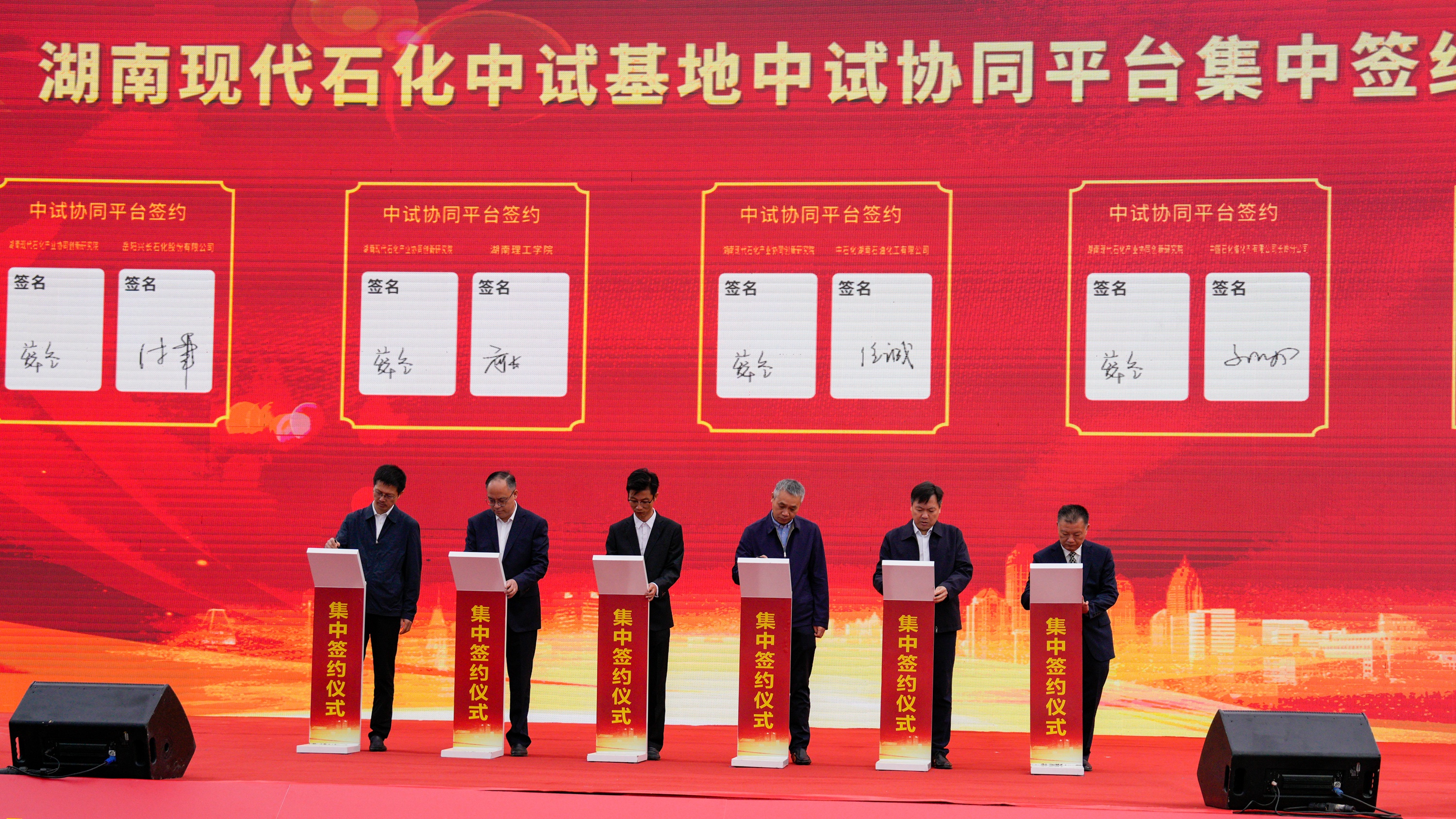 校园网讯 10月21日,湖南现代石化中试基地在岳阳市揭牌。作为湖南现代石化产业协同创新研究院主要依托单位之一,学校两个项目与湖南现代石化中试基地签约。党委书记张国云、校长曾祥君在现场见证签约,党委委员、副校长刘长辉参加有关签约活动。中试基地揭牌现场,作为唯一高校代表,学校和中石化湖南石油化工有限公司、中国石化催化剂有限公司长岭分公司、岳阳兴长石化股份有限公司、湖南长炼新材料科技股份公司一起,与湖南现...