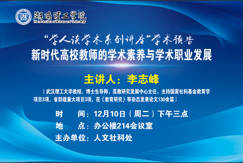 <span>主讲人:</span>李志锋<br/> <span>主题:</span>新时代高校教师的学术素养与学术职业发展<br/> <span>时间:</span>2019年12月10日(周二)下午三点<br/> <span>地点:</span>办公楼214会议室