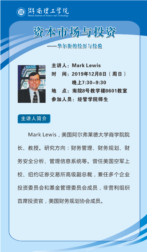 <span>主讲人:</span>Mark Lewis<br/> <span>主题:</span>资本市场与投资—华尔街的经历与经验<br/> <span>时间:</span>2019年12月8日(周日)晚上7:30—9:30(周日)<br/> <span>地点:</span>南院8号教学楼8601教室