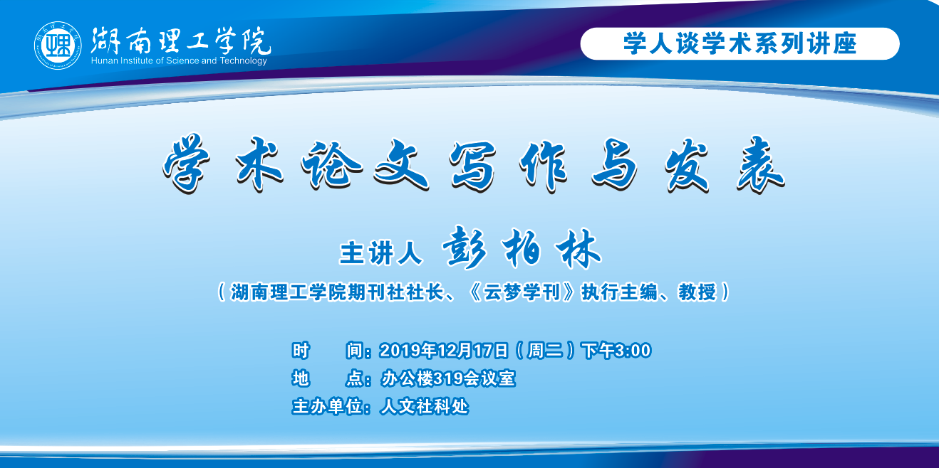 <span>主讲人:</span>彭柏林<br/> <span>主题:</span>“学人谈学术系列讲座”预告——学术论文写作与发表<br/> <span>时间:</span>2019年12月17日(周二)下午三点<br/> <span>地点:</span>办公楼319会议室