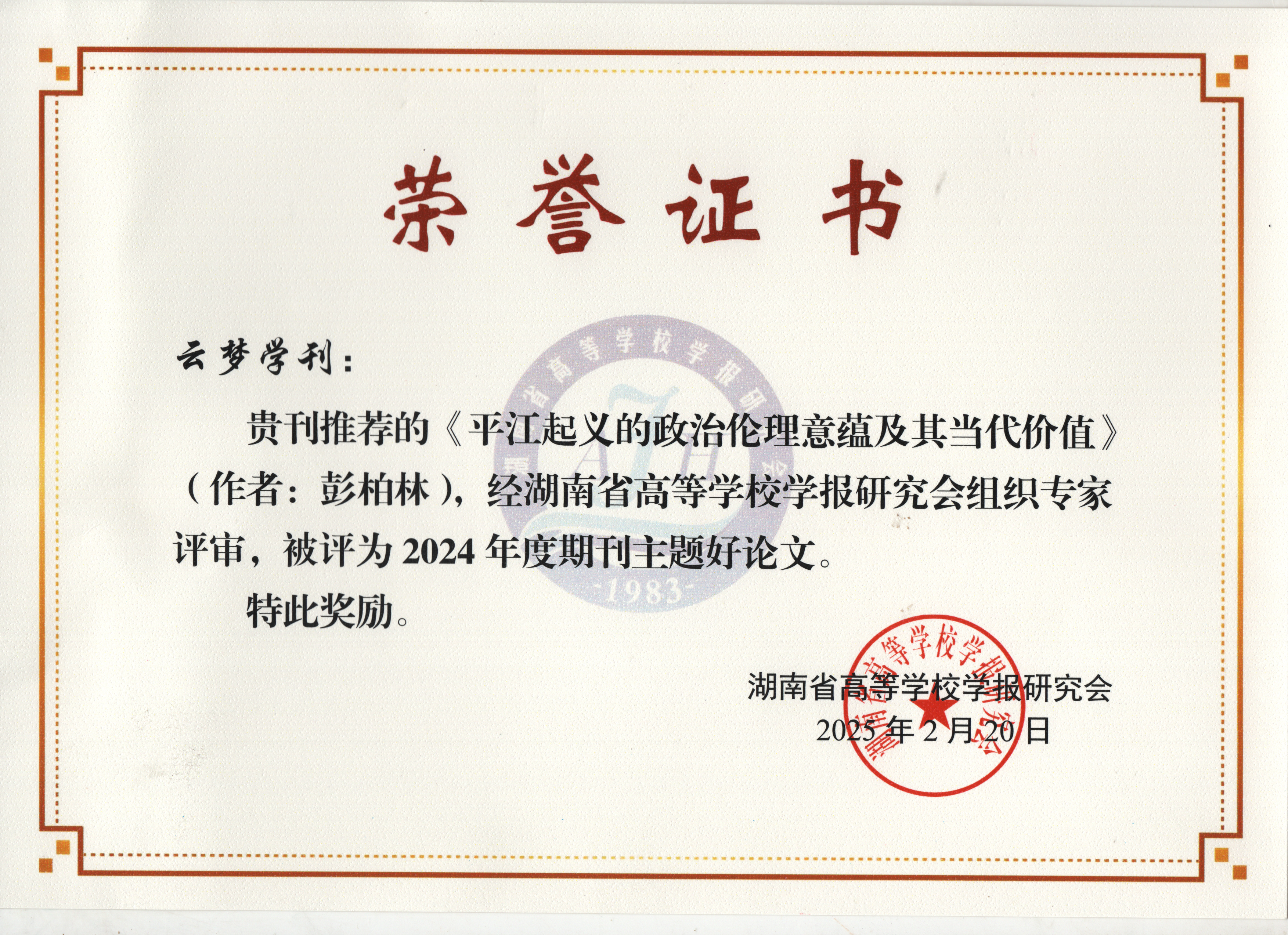 校园网讯近日,湖南省高等学校学报研究会2024年度会员大会在湖北咸宁召开。会议公布了2024年湖南省高等学校学报研究会关于“学习贯彻二十大、二十届三中全会精神,推动学术期刊高质量发展”为主题的主题论文、编辑学论文(论著)的评选结果,beat365彭柏林教授发表于《云梦学刊》2024年第1期的文章《平江起义的政治伦理意蕴及其当代价值》被评为“2024年度期刊主题好论文”。该文学习宣传贯彻党的二十大报告提出的“弘扬以伟大建党...