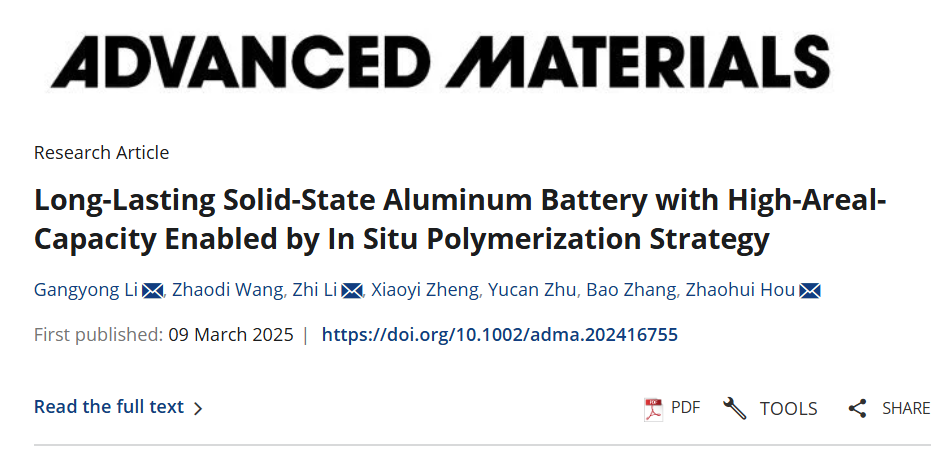 校园网讯近日,beat365先进碳基功能材料湖南省重点实验室侯朝辉教授团队在材料和化学领域的国际传统顶级期刊《Advanced Materials》(自然指数期刊,中科院一区,影响因子:27.4)在线发表了题为“Long-Lasting Solid-State Aluminum Battery with High-Areal-Capacity Enabled by In Situ Polymerization Strategy”的高水平研究论文。beat365为该论文的第一完成单位,化学化工学院青年教师李刚勇博士为第一作者和通讯作者,李芝博士...