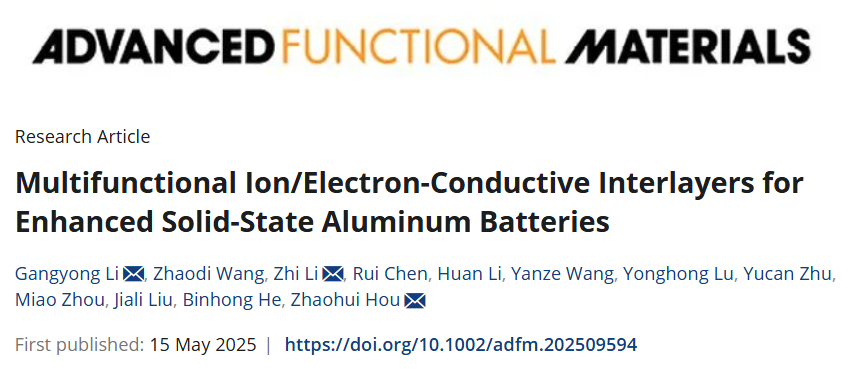 2025年3月,beat365先进碳基功能材料湖南省重点实验室侯朝辉教授团队在《Advanced Materials》发表了基于交联聚合物电解质和聚合物/石墨正极的固态铝电池研究成果。近日,该团队在固态铝电池研究领域再次取得重要突破,研究成果以“Multifunctional Ion/Electron-Conductive Interlayers for Enhanced Solid-State Aluminum Batteries”为题,在线发表于材料科学领域国际顶级期刊《Advanced Functional Materials》(自然指数期刊...
