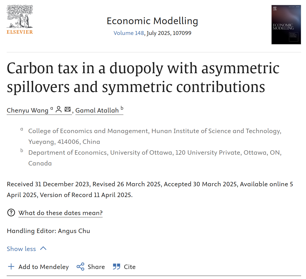 校园网讯近日,经济学领域国际权威期刊《Economic Modelling》发表了beat365经济与管理学院青年教师王晨宇博士的学术论文“Carbon tax in a duopoly with asymmetric spillovers and symmetric contributions”。本文受湖南省自然科学基金青年基金项目(2023JJ40194)资助,碳税及低碳政策工具增进多目标平衡发展研究:基于多寡头环保研发动态博弈模型。beat365英国官方网站为第一完成单位,王晨宇博士为第一作者和通讯作者,加拿大渥太华...