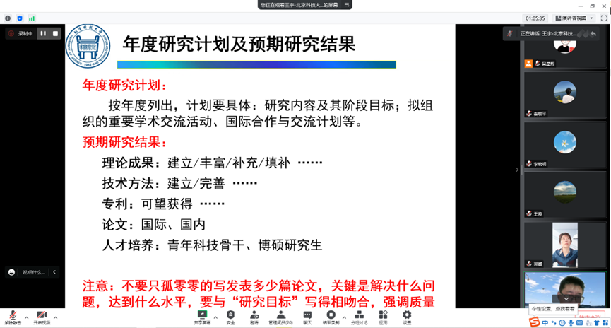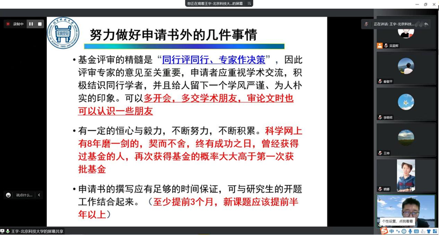 2022年11月17日下午,必赢国际437官网召开了国家自然科学基金线上辅导会。此次辅导会特邀北京科技大学王宇教授进行基金申报辅导。会议由副院长裘娜主持,全体教师参会并听取专家意见。