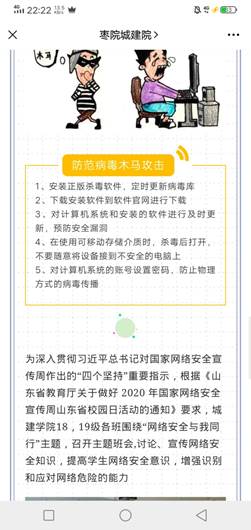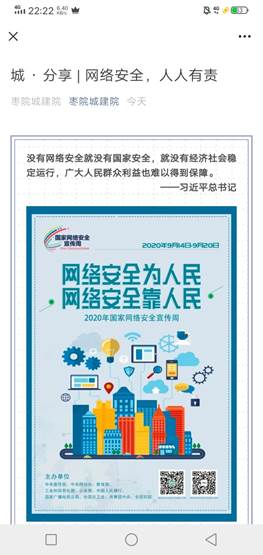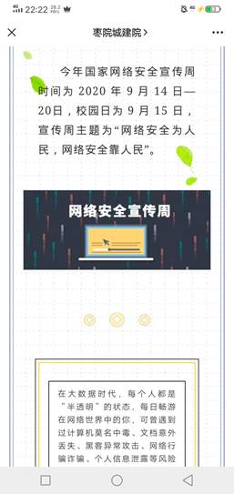2020年9月14日至9月20日是第七届国家网络安全宣传周。为贯彻落实“国家网络安全宣传周”活动的相关要求,学院开展了为期一周的网络安全宣传活动。