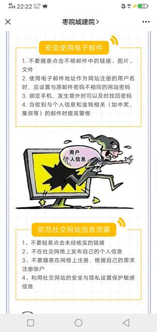 网络安全宣传周活动期间,学院积极开展线上、线下相关活动,不断强化主题宣传教育。9月16日,学院组织各班级开展了“网络安全与我同行”主题班会,通过学习相关材料,同学们了学习到了更多有关网络安全方面的内容。通过班会的学习、讨论之后,各班组织了同学们参加全民网络安全知识竞赛,激发同学们学习网络安全知识的兴趣,提升网络安全防护技能,增强安全防范意识,提高识别和应对网络危险的能力。通过学院官方微信、网站等新媒体推送网络安全知识,引导学院师生正确使用网络,提高网络道德观和法制观。多种形式广泛宣传个人网络信息保护、电信诈骗、网络暴力、网络法律维权等安全知识。