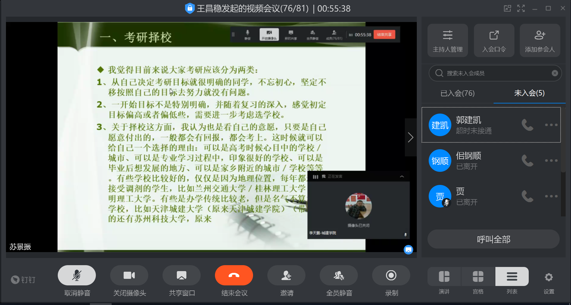 2020年6月17日上午9:00-10:30,必赢官网给排水科学与工程专业采用钉钉视频会议的形式组织召开了2017级考研动员会(既经验交流会)。给排水科学与工程专业全体教师、2017级全体同学及2018、2019级部分同学参加此次视频会议。