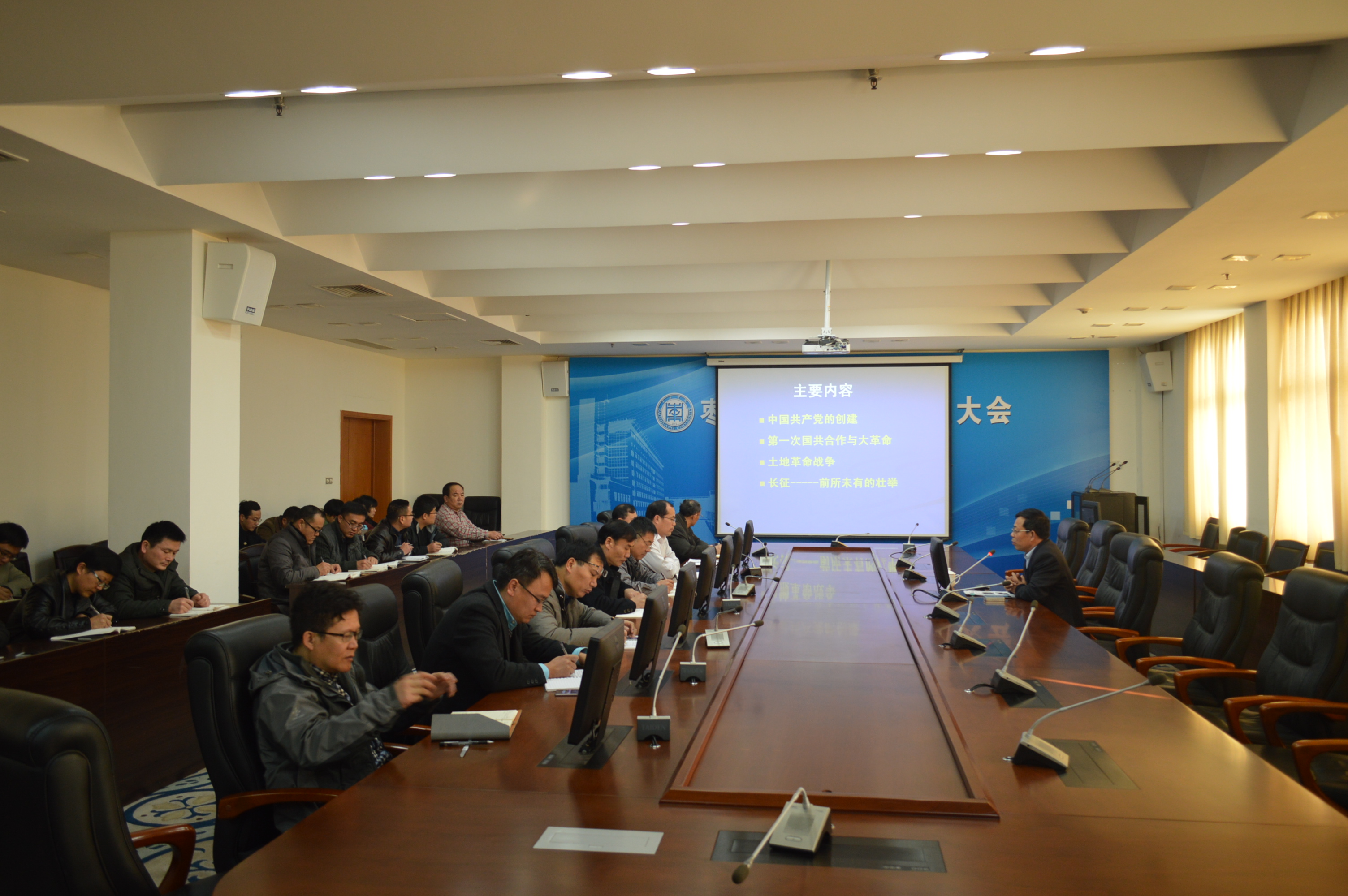 为进一步推进“两学一做”工作开展,深入学习领会十八届六中全会会议精神,12月2日,明清河副校长在综合楼三楼,为分管部门和城建学院开展了一次主题为“铭记党的历史,弘扬伟大精神”的党课教育。
