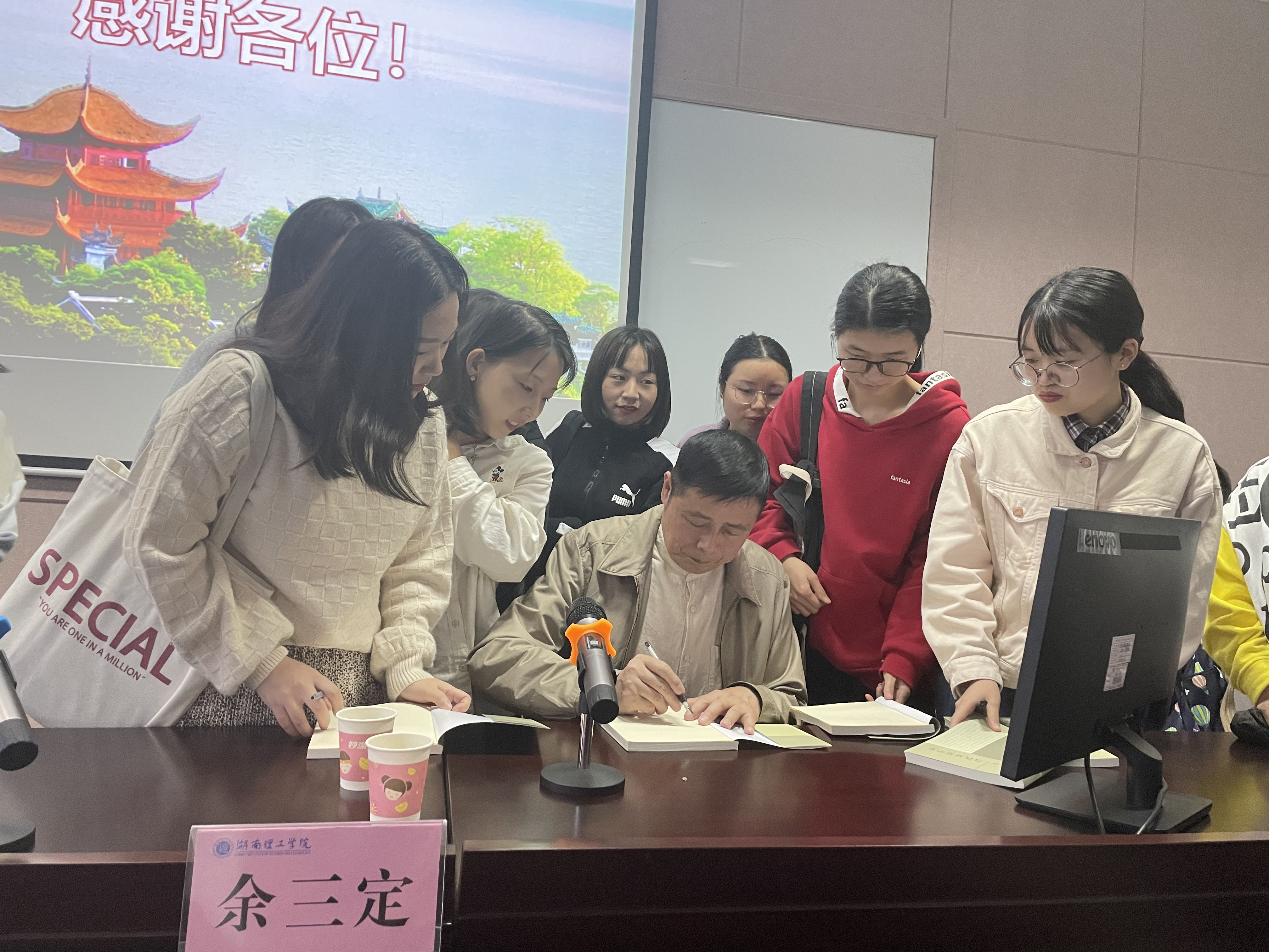 讲座结束后,余三定向在场师生签名赠送自己的著作,鼓励同学们多读书、读好书,并送上自己的美好祝愿:“快乐读书拥书生本色,实在做人持人间常情”。(通讯员/张瑾 曾婧 责编/田夏)