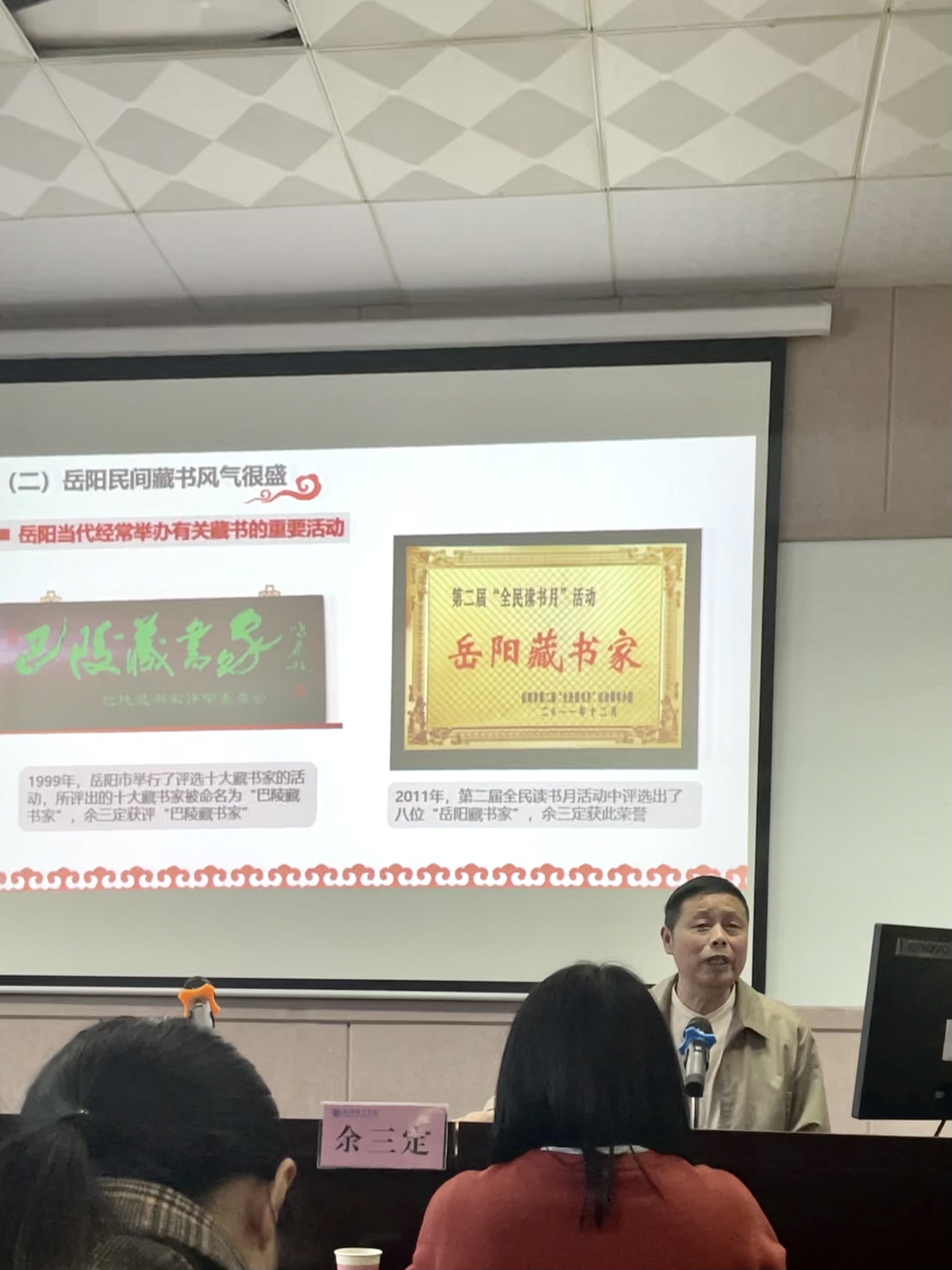 余三定以“藏书与读书”为主题,从两个方面展开讲述。一是关于藏书,他以幽默的语言讲述岳阳民间藏书家背后的故事与经历,一同感悟学者大师对藏书的热爱。他介绍了自己的私人藏书楼——“南湖藏书楼”的特点及功能,并提倡家有藏书赶快读。二是关于读书,他提倡快乐读书观,读书是目的快乐和过程快乐的有机统一,教育硕士研究生要自觉阅读专业之外的书籍,读经典好书,多动笔记录并写作。