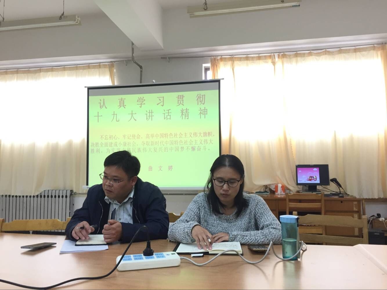 10月25日主题党日,由教工党支部曲文婷同志主持,学习了十九大会议精神,李天鹏、徐鸿飞两位同志做了交流发言。